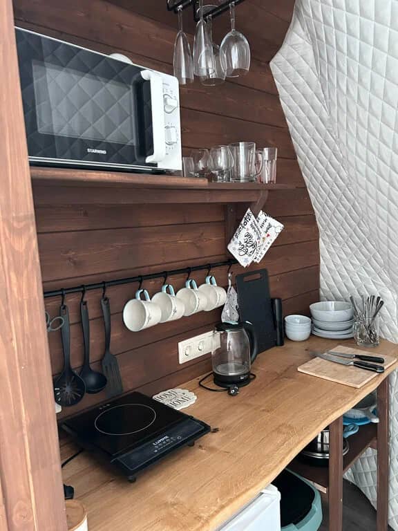 Удобная кухонная зона с техникой и красивой посудой для лёгких завтраков и ужинов