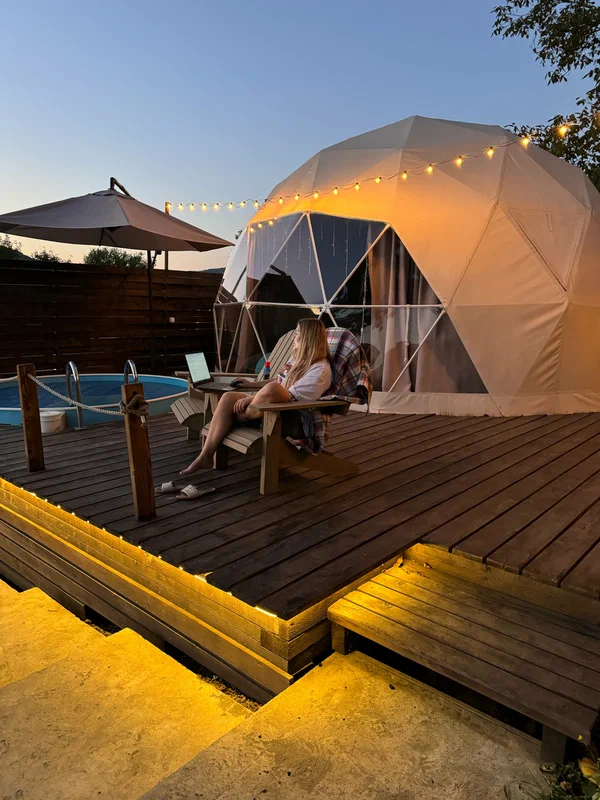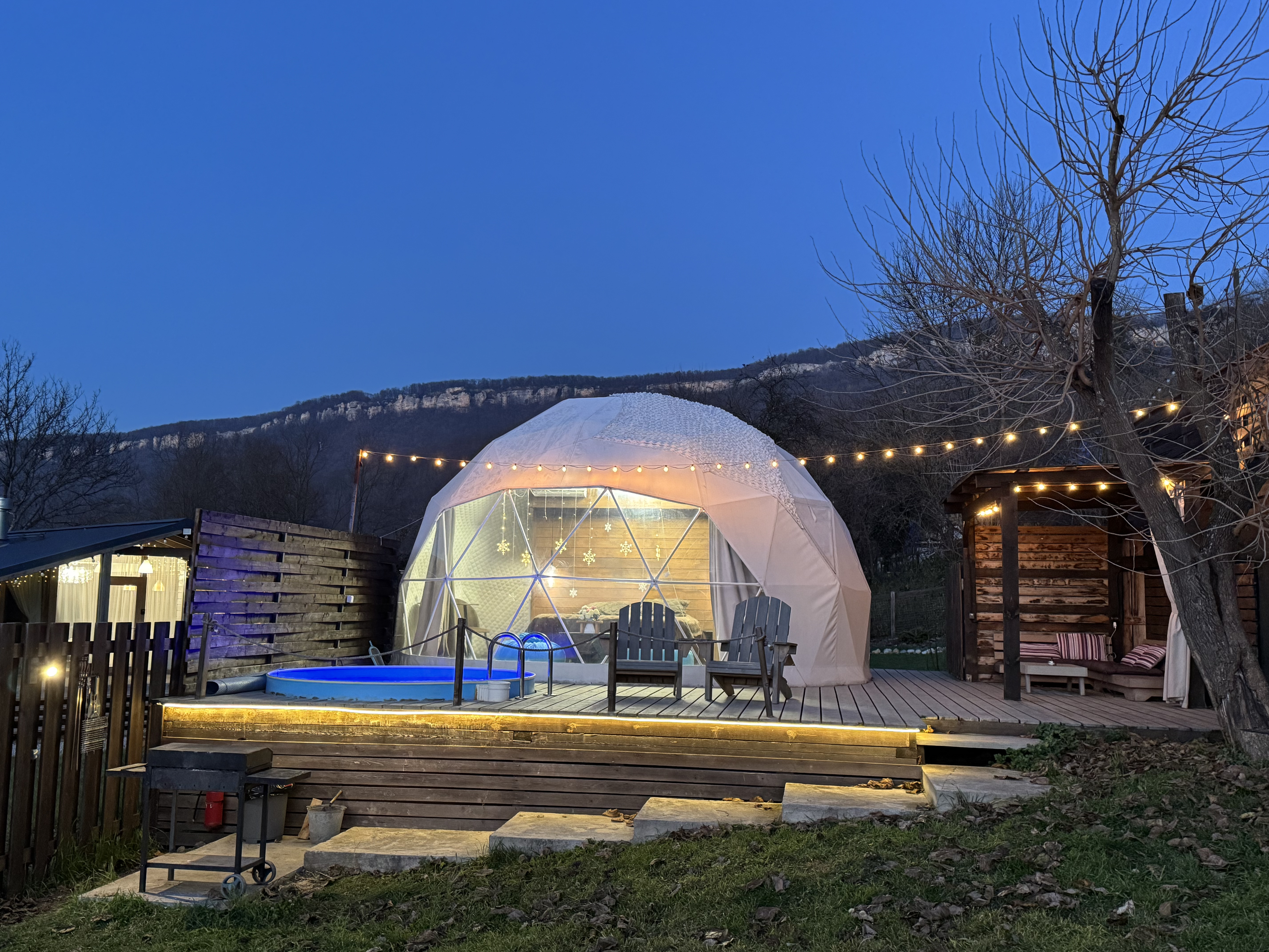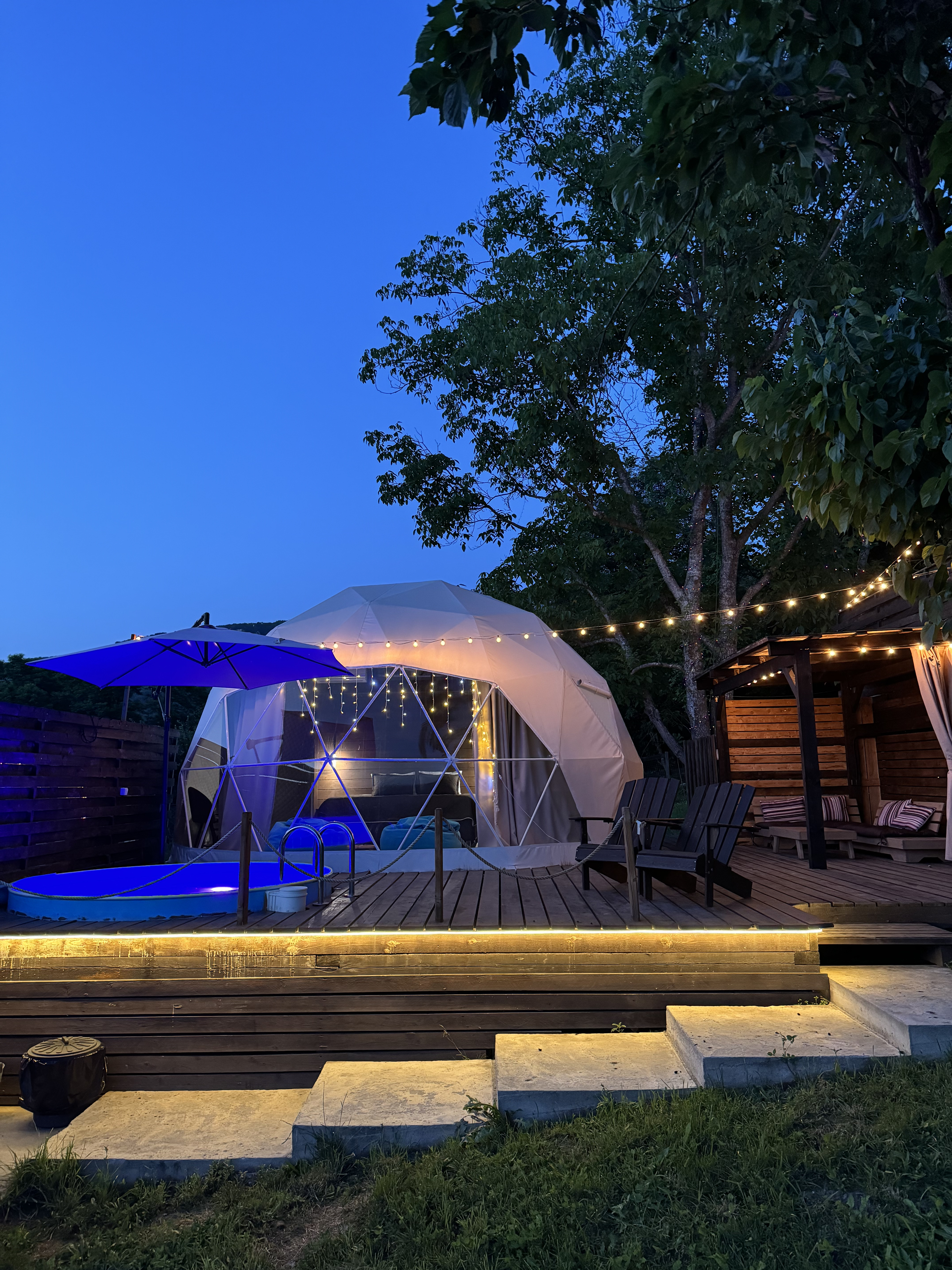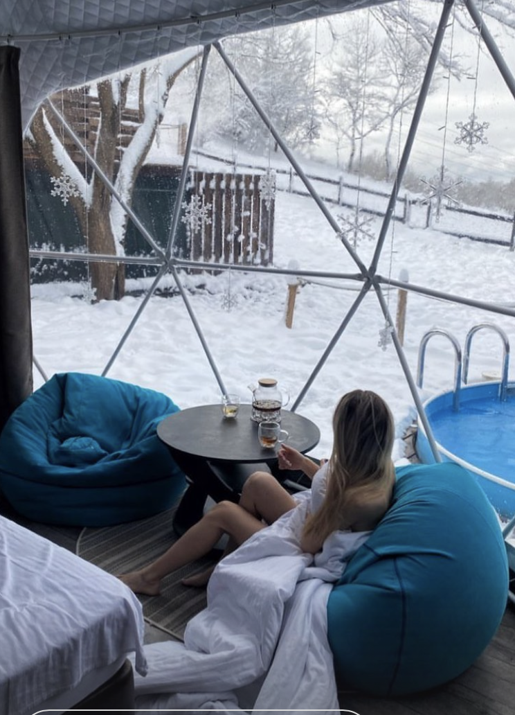 Личное джакузи у каждой сферы с подогревом (36'), гидромассажем и ночной подсветкой — расслабление в любое время года